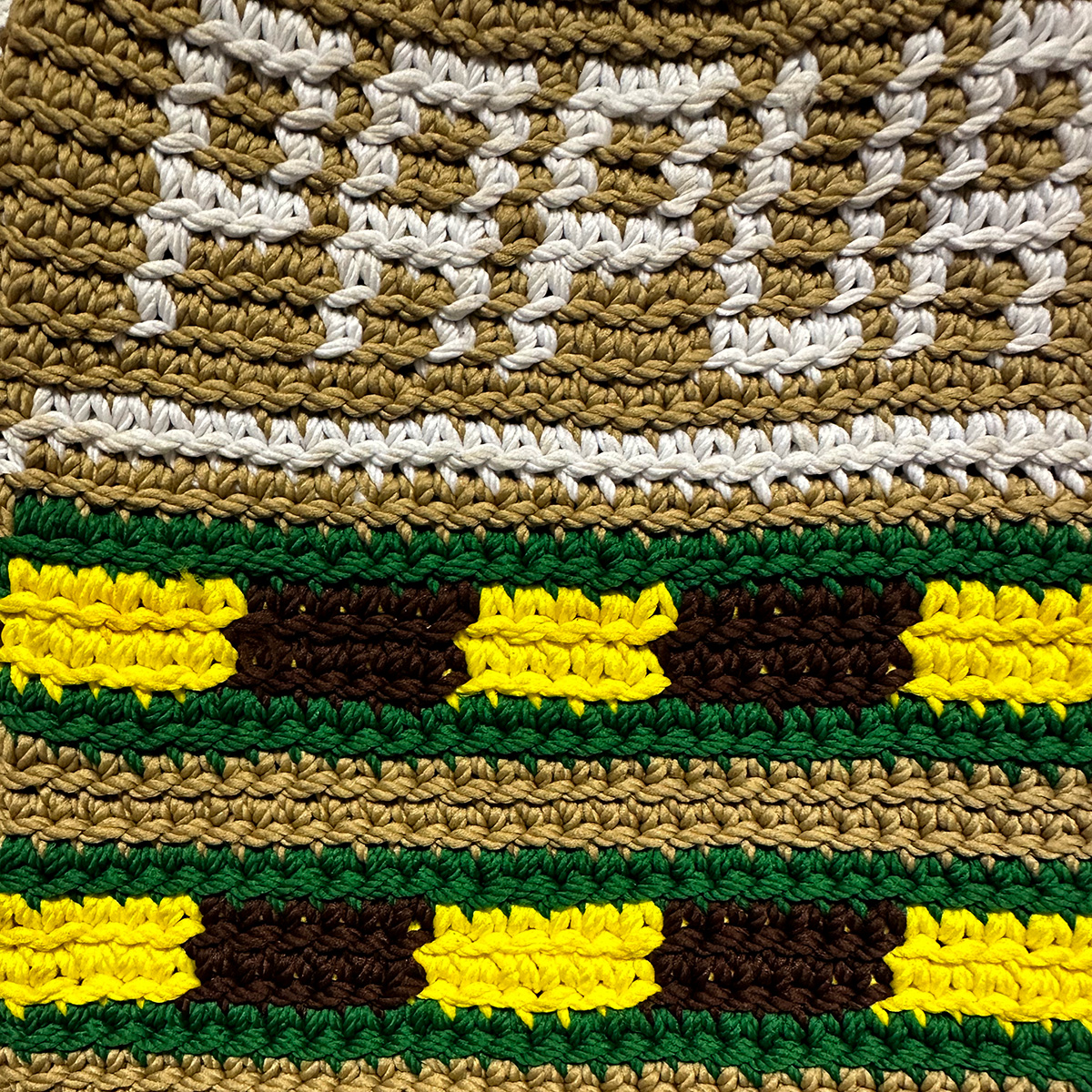 Het bovenstuk is rustig gehouden met beige en wit, terwijl de onderzijde is versierd met horizontale patronen in geel, groen en donkerbruin. Het woord PAPUA is sierlijk ingehaakt aan de bovenzijde.