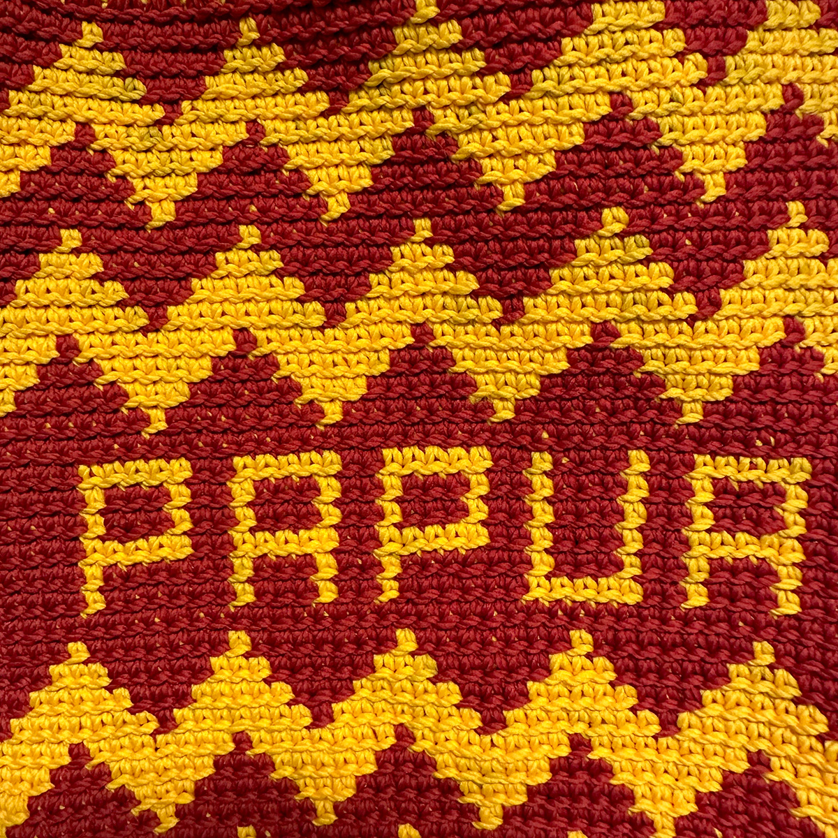 Het zigzagpatroon geeft de tas een levendige uitstraling, terwijl het woord PAPUA subtiel is meegehaakt in het ontwerp.